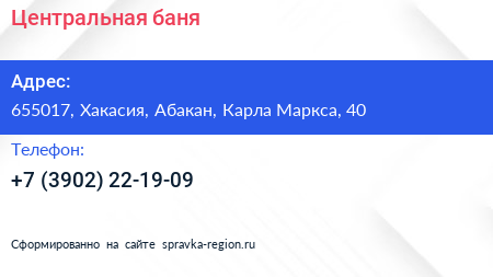 Центральная баня по адресу 655017, Хакасия, Абакан, Карла Маркса, 40 в дальнейшем Организация, размещена в следующих категориях: