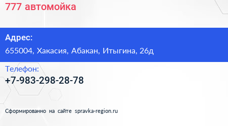 777, автомойка по адресу 655004, Хакасия, Абакан, Итыгина, 26д в дальнейшем Организация, размещена в следующих категориях: