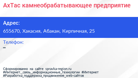 АхТас, камнеобрабатывающее предприятие по адресу 655670, Хакасия, Абакан, Кирпичная, 25 в дальнейшем Организация, размещена в следующих категориях: