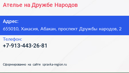 Ателье на Дружбе Народов по адресу 655010, Хакасия, Абакан, проспект Дружбы народов, 2 в дальнейшем Организация, размещена в следующих категориях: