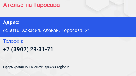 Ателье на Торосова по адресу 655016, Хакасия, Абакан, Торосова, 21 в дальнейшем Организация, размещена в следующих категориях: