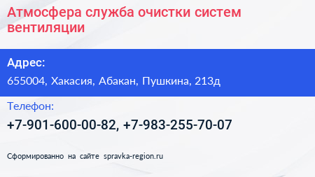 Атмосфера, служба очистки систем вентиляции по адресу 655004, Хакасия, Абакан, Пушкина, 213д в дальнейшем Организация, размещена в следующих категориях: