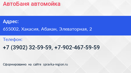 АвтоБаня, автомойка по адресу 655002, Хакасия, Абакан, Элеваторная, 2 в дальнейшем Организация, размещена в следующих категориях: