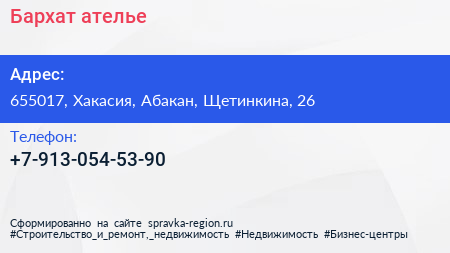 Бархат, ателье по адресу 655017, Хакасия, Абакан, Щетинкина, 26 в дальнейшем Организация, размещена в следующих категориях: