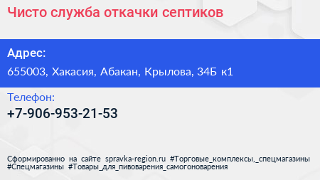 Чисто, служба откачки септиков по адресу 655003, Хакасия, Абакан, Крылова, 34Б к1 в дальнейшем Организация, размещена в следующих категориях:
