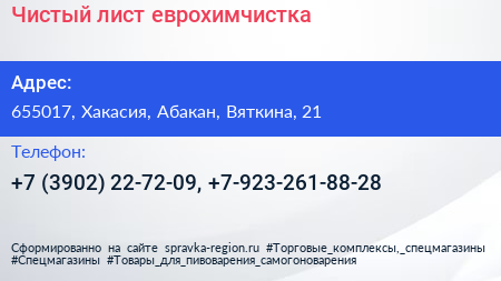 Чистый лист, еврохимчистка по адресу 655017, Хакасия, Абакан, Вяткина, 21 в дальнейшем Организация, размещена в следующих категориях: