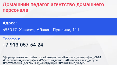 Домашний педагог, агентство домашнего персонала по адресу 655017, Хакасия, Абакан, Пушкина, 111 в дальнейшем Организация, размещена в следующих категориях: