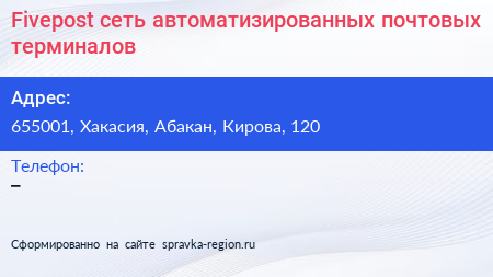 Fivepost, сеть автоматизированных почтовых терминалов по адресу 655001, Хакасия, Абакан, Кирова, 120 в дальнейшем Организация, размещена в следующих категориях: