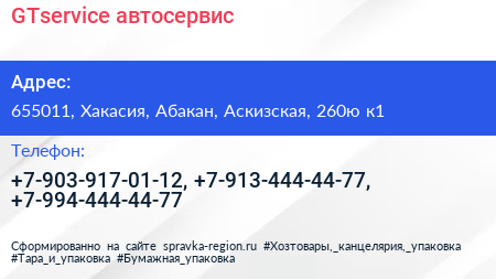 GTservice, автосервис по адресу 655011, Хакасия, Абакан, Аскизская, 260ю к1 в дальнейшем Организация, размещена в следующих категориях: