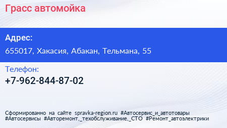 Грасс, автомойка по адресу 655017, Хакасия, Абакан, Тельмана, 55 в дальнейшем Организация, размещена в следующих категориях: