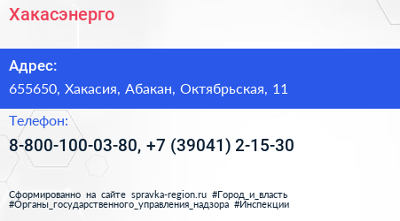 Хакасэнерго по адресу 655650, Хакасия, Абакан, Октябрьская, 11 в дальнейшем Организация, размещена в следующих категориях:
