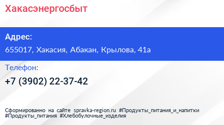 Хакасэнергосбыт по адресу 655017, Хакасия, Абакан, Крылова, 41а в дальнейшем Организация, размещена в следующих категориях: