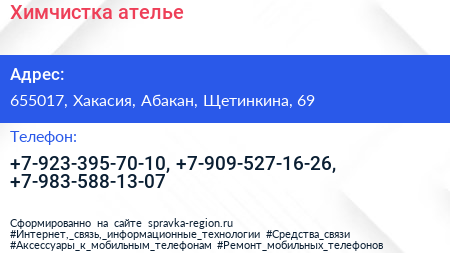 Химчистка-ателье по адресу 655017, Хакасия, Абакан, Щетинкина, 69 в дальнейшем Организация, размещена в следующих категориях: