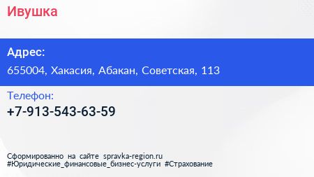 Ивушка по адресу 655004, Хакасия, Абакан, Советская, 113 в дальнейшем Организация, размещена в следующих категориях: