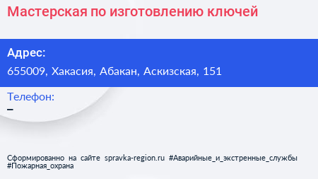 Мастерская по изготовлению ключей по адресу 655009, Хакасия, Абакан, Аскизская, 151 в дальнейшем Организация, размещена в следующих категориях: