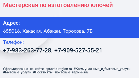 Мастерская по изготовлению ключей по адресу 655016, Хакасия, Абакан, Торосова, 7Б в дальнейшем Организация, размещена в следующих категориях: