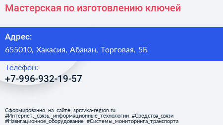 Мастерская по изготовлению ключей по адресу 655010, Хакасия, Абакан, Торговая, 5Б в дальнейшем Организация, размещена в следующих категориях: