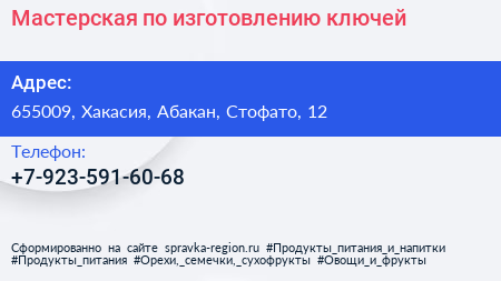 Мастерская по изготовлению ключей по адресу 655009, Хакасия, Абакан, Стофато, 12 в дальнейшем Организация, размещена в следующих категориях: