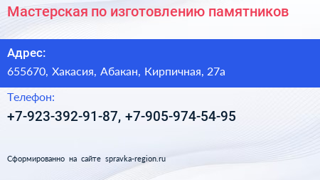 Мастерская по изготовлению памятников по адресу 655670, Хакасия, Абакан, Кирпичная, 27а в дальнейшем Организация, размещена в следующих категориях: