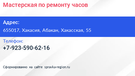 Мастерская по ремонту часов по адресу 655017, Хакасия, Абакан, Хакасская, 55 в дальнейшем Организация, размещена в следующих категориях: