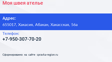 Моя швея, ателье по адресу 655017, Хакасия, Абакан, Хакасская, 56а в дальнейшем Организация, размещена в следующих категориях: