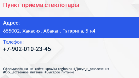 Пункт приема стеклотары по адресу 655002, Хакасия, Абакан, Гагарина, 5 к4 в дальнейшем Организация, размещена в следующих категориях: