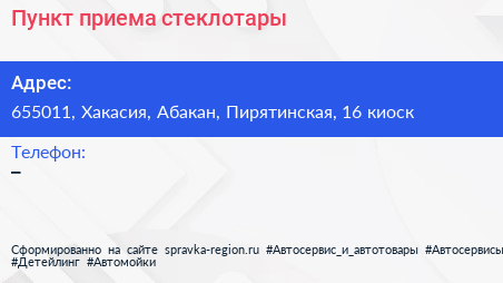 Пункт приема стеклотары по адресу 655011, Хакасия, Абакан, Пирятинская, 16 киоск в дальнейшем Организация, размещена в следующих категориях: