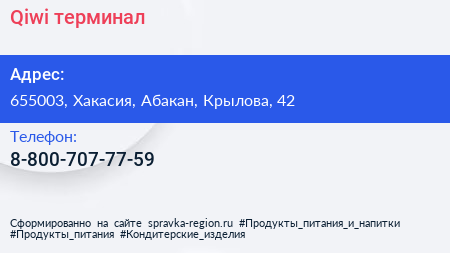Qiwi, терминал по адресу 655003, Хакасия, Абакан, Крылова, 42 в дальнейшем Организация, размещена в следующих категориях:
