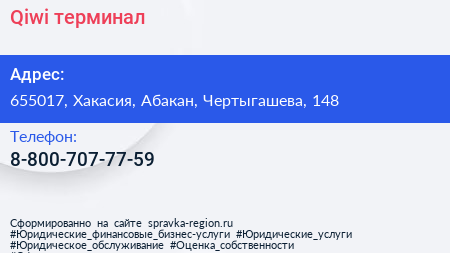 Qiwi, терминал по адресу 655017, Хакасия, Абакан, Чертыгашева, 148 в дальнейшем Организация, размещена в следующих категориях: