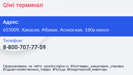 Qiwi, терминал по адресу 655009, Хакасия, Абакан, Аскизская, 160а киоск в дальнейшем Организация, размещена в следующих категориях: