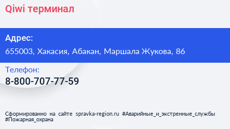 Qiwi, терминал по адресу 655003, Хакасия, Абакан, Маршала Жукова, 86 в дальнейшем Организация, размещена в следующих категориях: