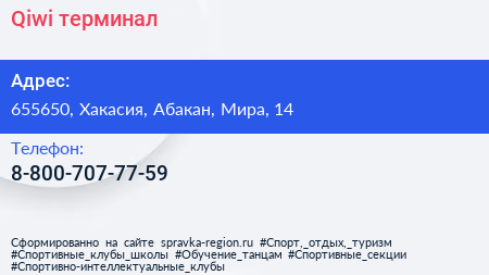 Qiwi, терминал по адресу 655650, Хакасия, Абакан, Мира, 14 в дальнейшем Организация, размещена в следующих категориях: