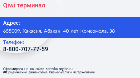 Qiwi, терминал по адресу 655009, Хакасия, Абакан, 40 лет Комсомола, 38 в дальнейшем Организация, размещена в следующих категориях: