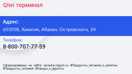 Qiwi, терминал по адресу 655018, Хакасия, Абакан, Островского, 24 в дальнейшем Организация, размещена в следующих категориях: