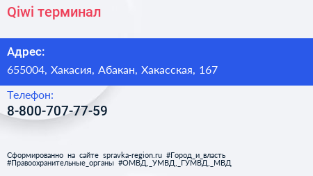 Qiwi, терминал по адресу 655004, Хакасия, Абакан, Хакасская, 167 в дальнейшем Организация, размещена в следующих категориях:
