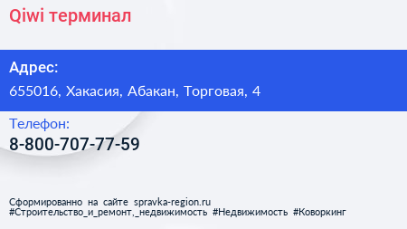 Qiwi, терминал по адресу 655016, Хакасия, Абакан, Торговая, 4 в дальнейшем Организация, размещена в следующих категориях:
