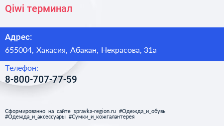 Qiwi, терминал по адресу 655004, Хакасия, Абакан, Некрасова, 31а в дальнейшем Организация, размещена в следующих категориях: