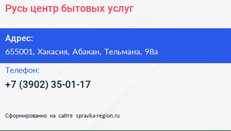 Русь, центр бытовых услуг по адресу 655001, Хакасия, Абакан, Тельмана, 98а в дальнейшем Организация, размещена в следующих категориях:
