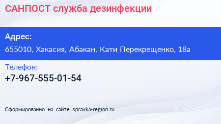 САНПОСТ, служба дезинфекции по адресу 655010, Хакасия, Абакан, Кати Перекрещенко, 18а в дальнейшем Организация, размещена в следующих категориях: