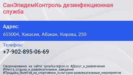 СанЭпидемКонтроль, дезинфекционная служба по адресу 655004, Хакасия, Абакан, Кирова, 250 в дальнейшем Организация, размещена в следующих категориях: