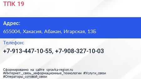ТПК-19 по адресу 655004, Хакасия, Абакан, Игарская, 13Б в дальнейшем Организация, размещена в следующих категориях:
