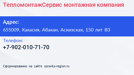 ТепломонтажСервис, монтажная компания по адресу 655009, Хакасия, Абакан, Аскизская, 150 лит В3 в дальнейшем Организация, размещена в следующих категориях: