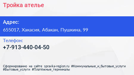 Тройка, ателье по адресу 655017, Хакасия, Абакан, Пушкина, 99 в дальнейшем Организация, размещена в следующих категориях: