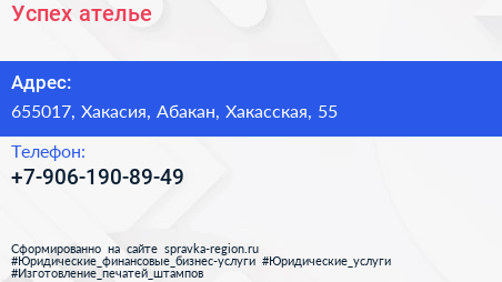 Успех, ателье по адресу 655017, Хакасия, Абакан, Хакасская, 55 в дальнейшем Организация, размещена в следующих категориях: