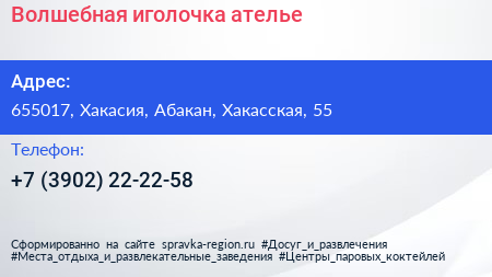 Волшебная иголочка, ателье по адресу 655017, Хакасия, Абакан, Хакасская, 55 в дальнейшем Организация, размещена в следующих категориях:
