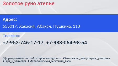 Золотое руно, ателье по адресу 655017, Хакасия, Абакан, Пушкина, 113 в дальнейшем Организация, размещена в следующих категориях: