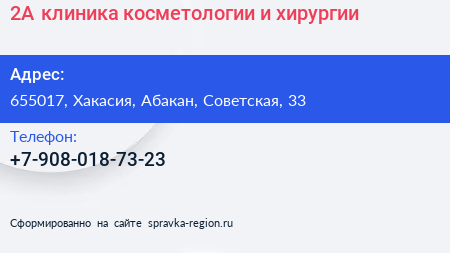 2А, клиника косметологии и хирургии по адресу 655017, Хакасия, Абакан, Советская, 33 в дальнейшем Организация, размещена в следующих категориях: