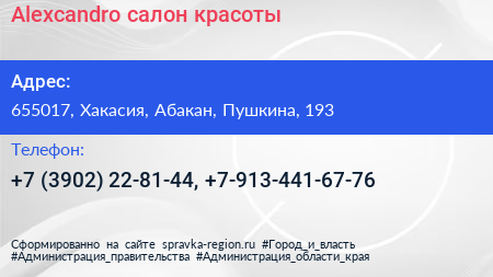 Alexсandro, салон красоты по адресу 655017, Хакасия, Абакан, Пушкина, 193 в дальнейшем Организация, размещена в следующих категориях: