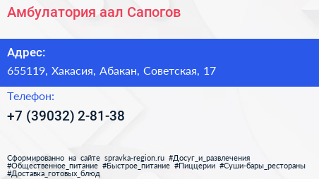 Амбулатория, аал Сапогов по адресу 655119, Хакасия, Абакан, Советская, 17 в дальнейшем Организация, размещена в следующих категориях: