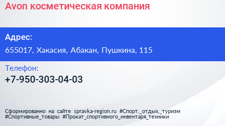 Avon, косметическая компания по адресу 655017, Хакасия, Абакан, Пушкина, 115 в дальнейшем Организация, размещена в следующих категориях: